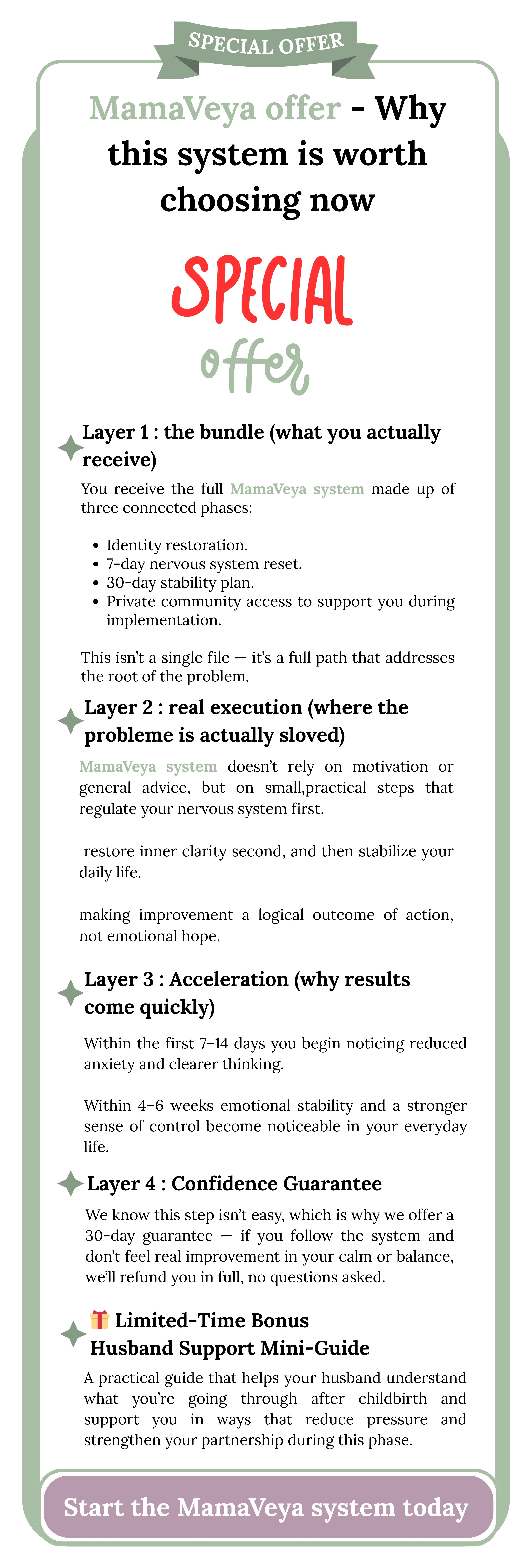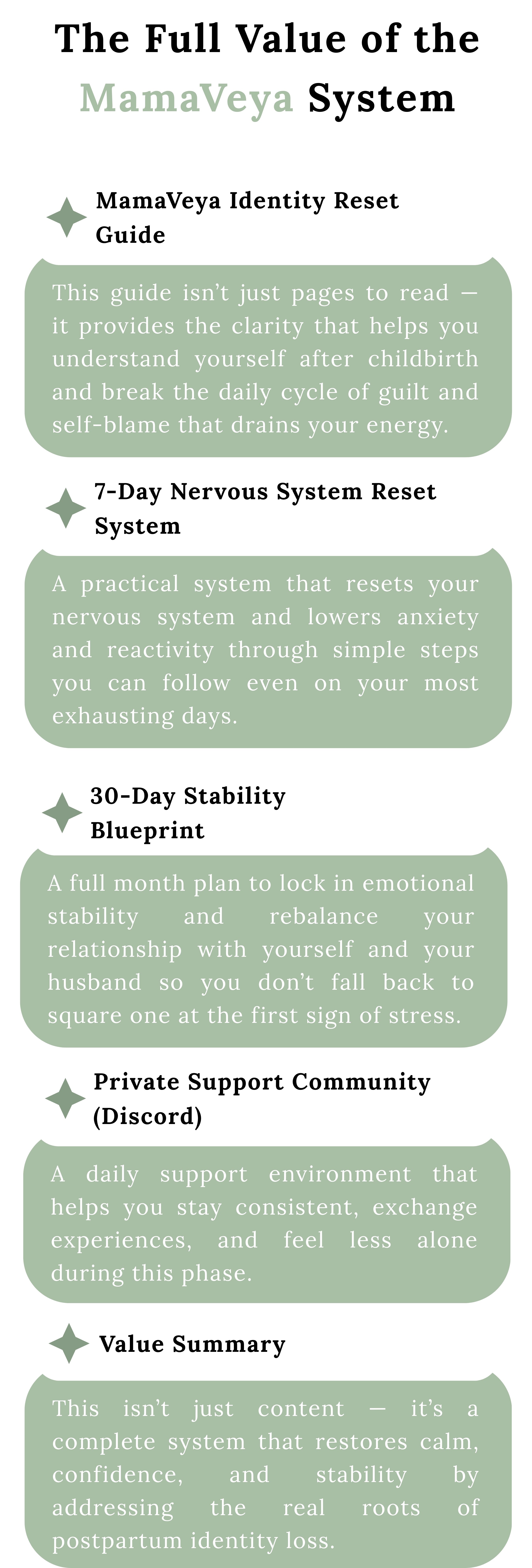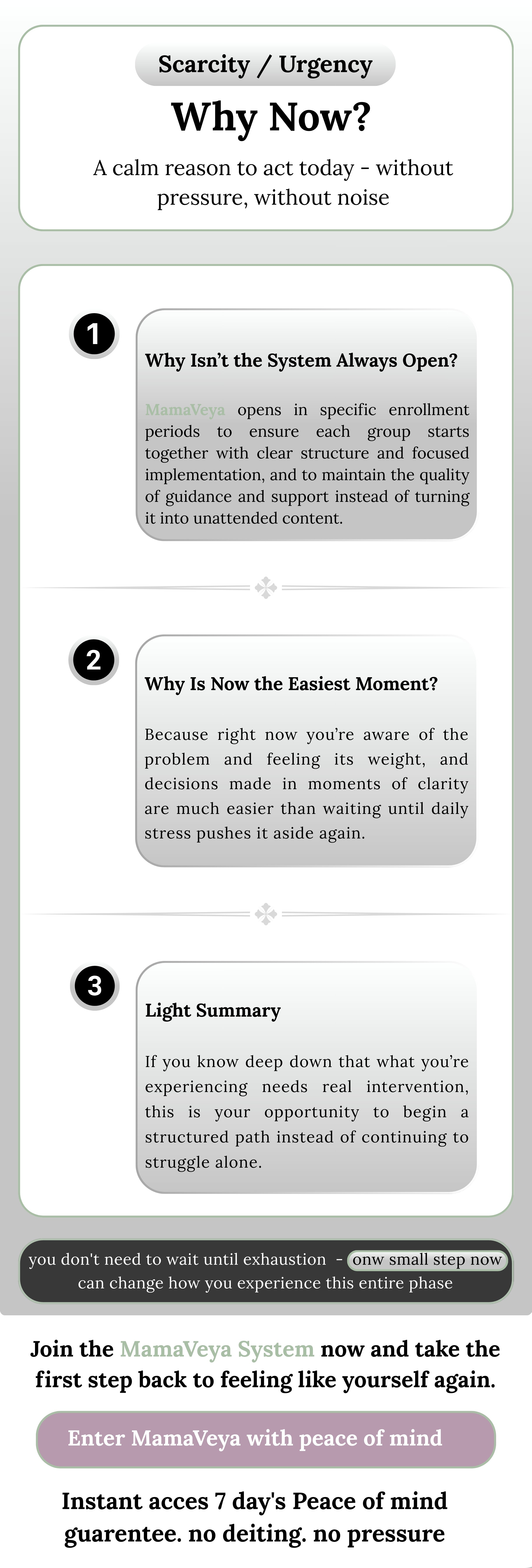 The system is designed for exhausted mothers, which is why it relies on small, realistic steps that take only minutes a day and can fit into even your most demanding days without adding pressure.